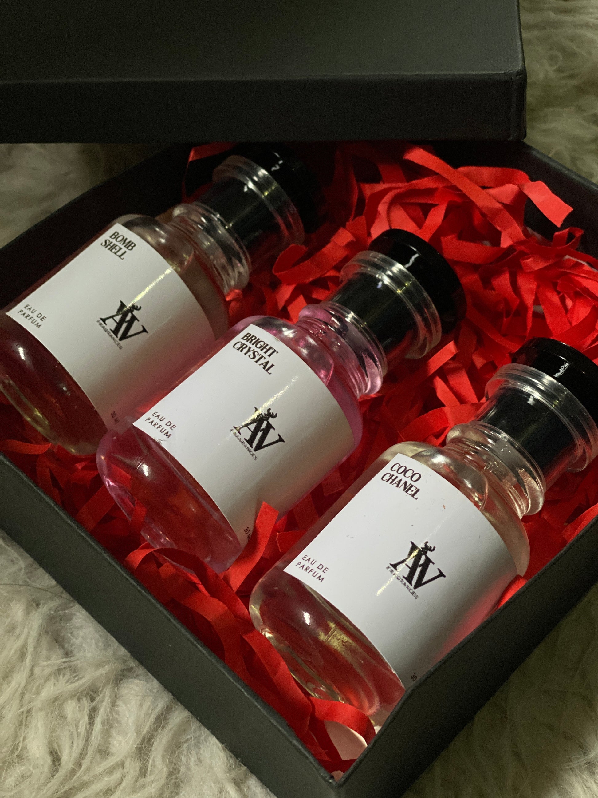 Trio Bundle includes three 30ml perfumes of your choice from our collection. Each fragrance offers a lasting scent that stays fresh for 9-10 hours. Customize your bundle to suit your preferences or mood. Great value deal perfect for trying multiple scents or gifting. Convenient size ideal for daily use and travel.